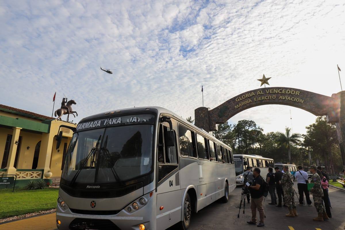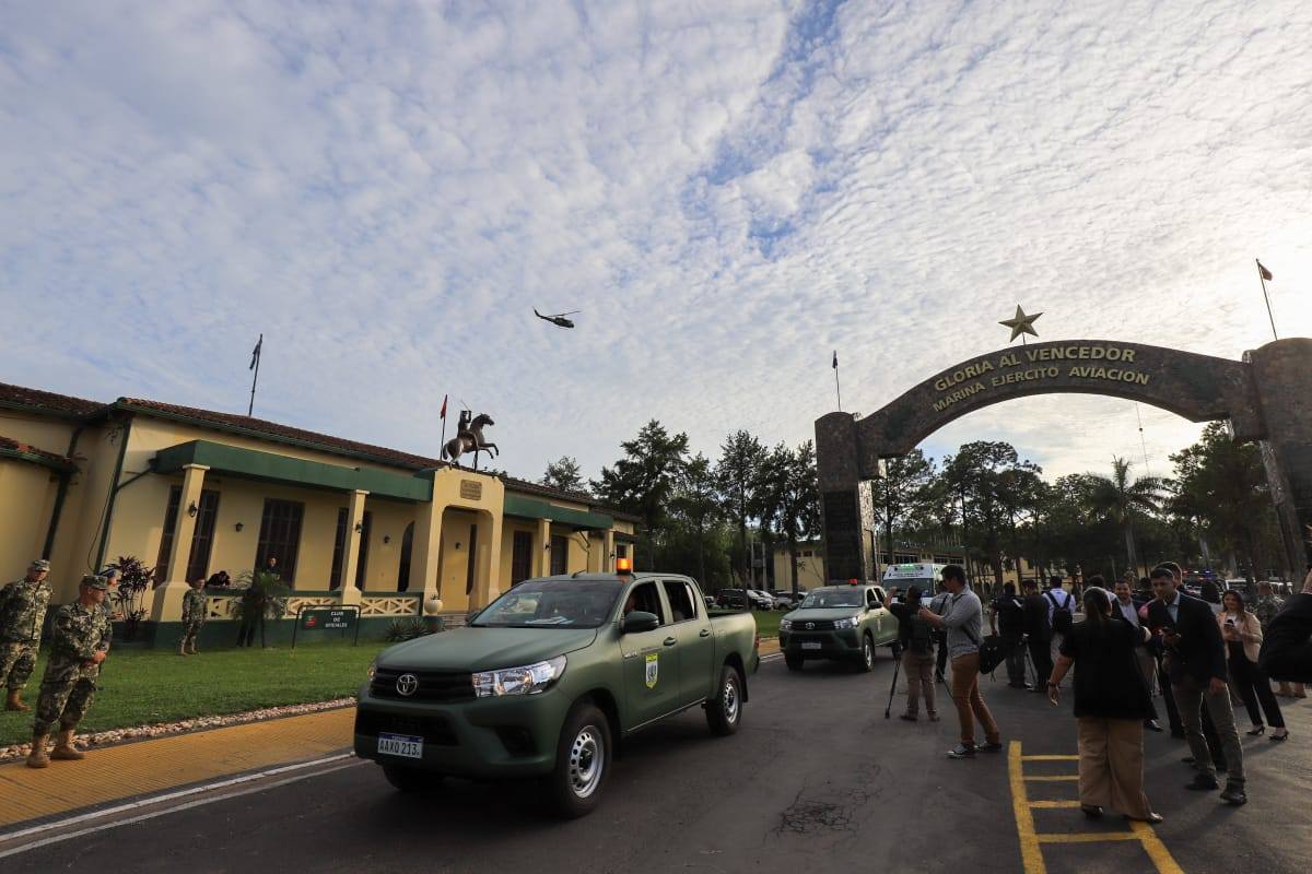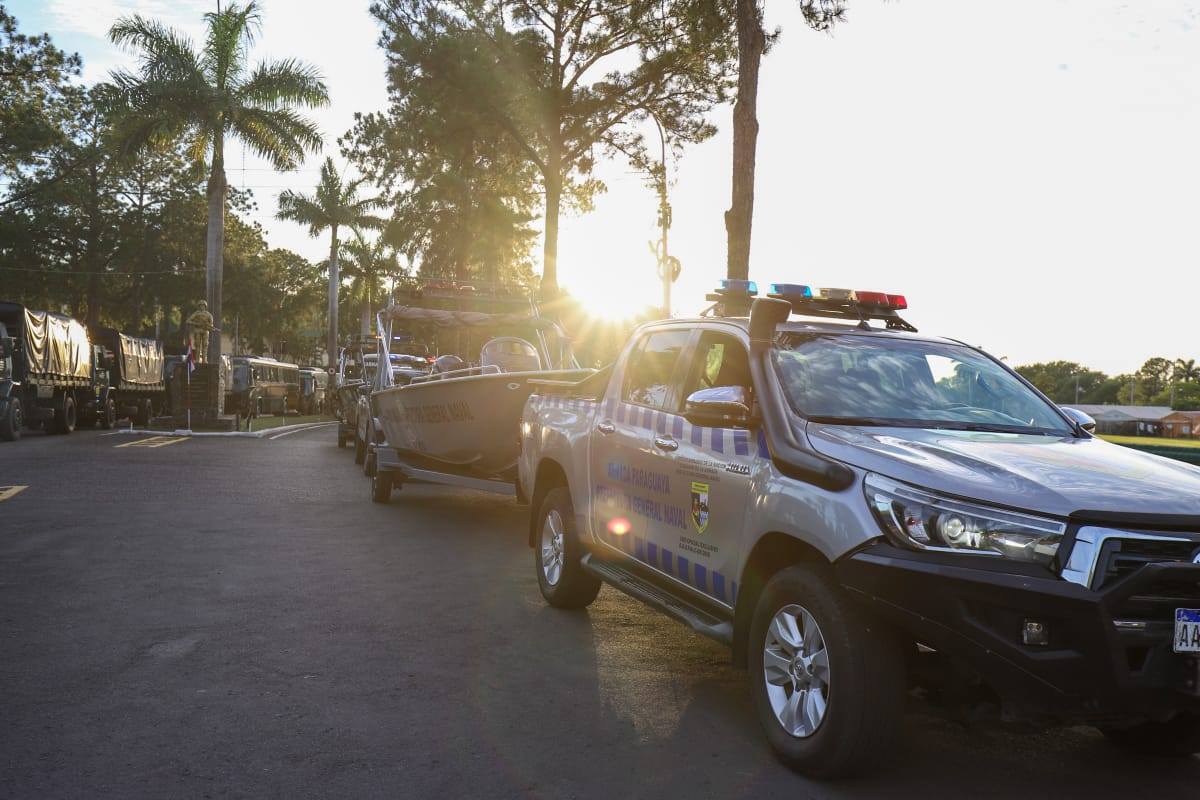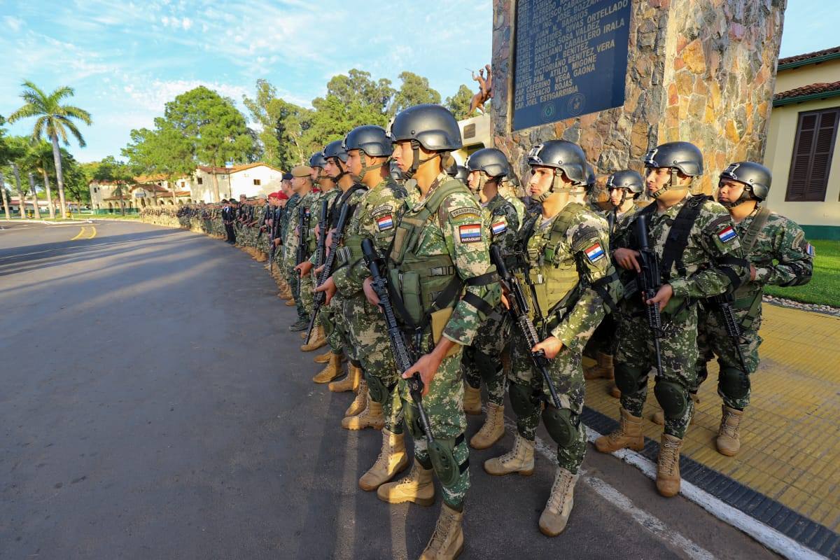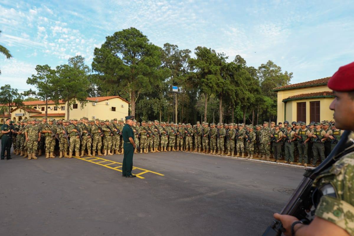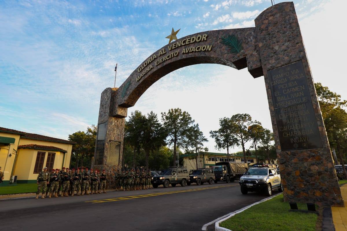 El Ministro de Defensa Nacional, Gral Ej (R) Óscar González, acompañado del Comandante de las Fuerzas Militares, Gral Ej César Moreno; y de los Comandantes de las Fuerzas Singulares y del Comando Logístico, encabezó una conferencia de prensa en la que brindó detalles sobre el desplazamiento de un contingente de oficiales y suboficiales de las Fuerzas Armadas de la Nación hacia las zonas fronterizas, en el marco de la Operación “Escudo Guaraní”, ordenada por el Excelentísimo Señor Presidente de la República y Comandante en Jefe de las Fuerzas Armadas de la Nación, Santiago Peña.