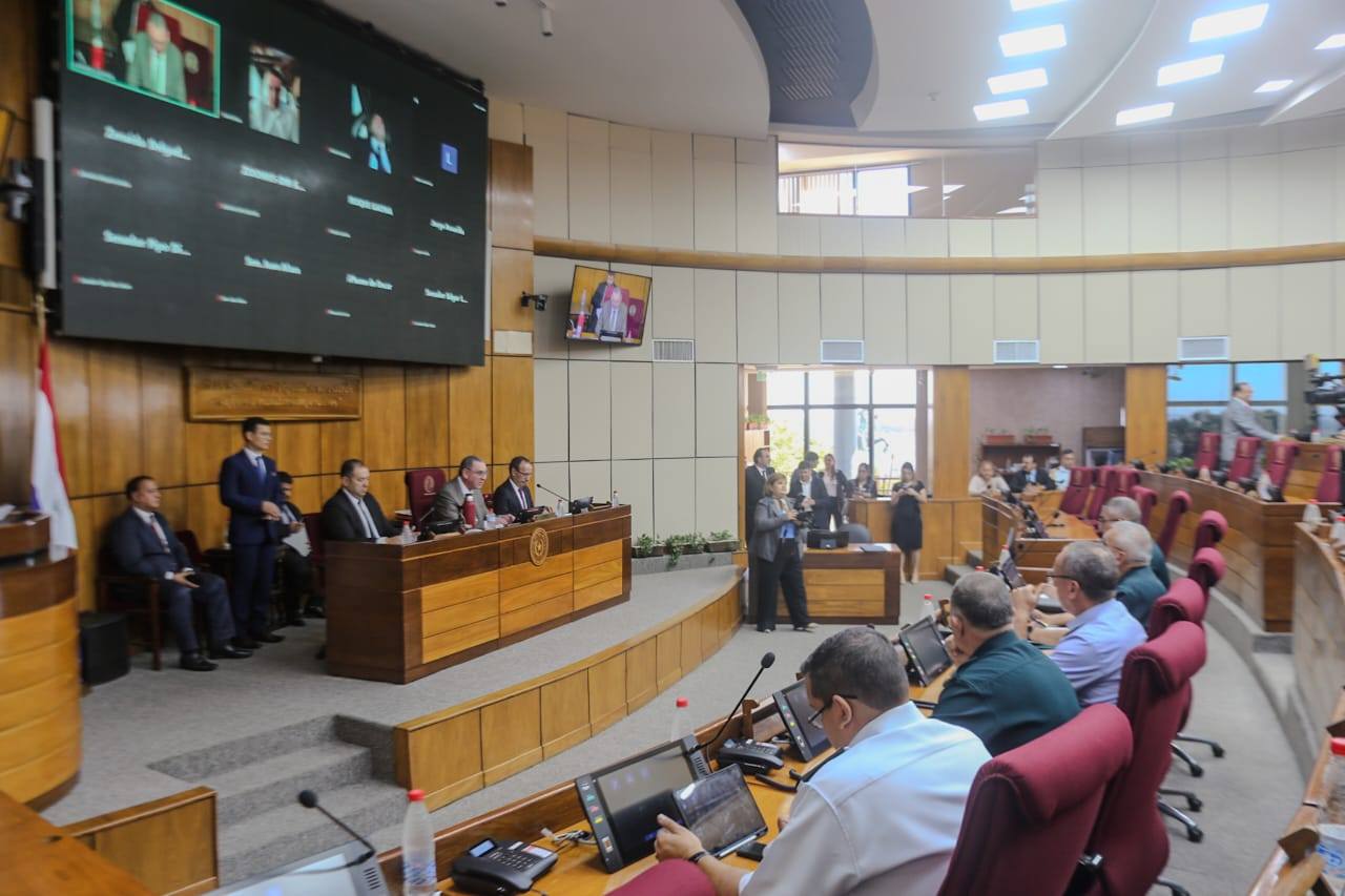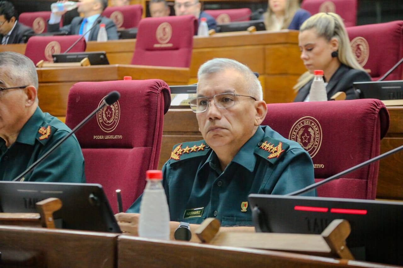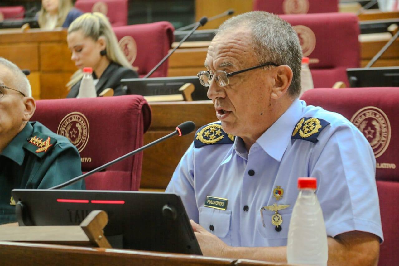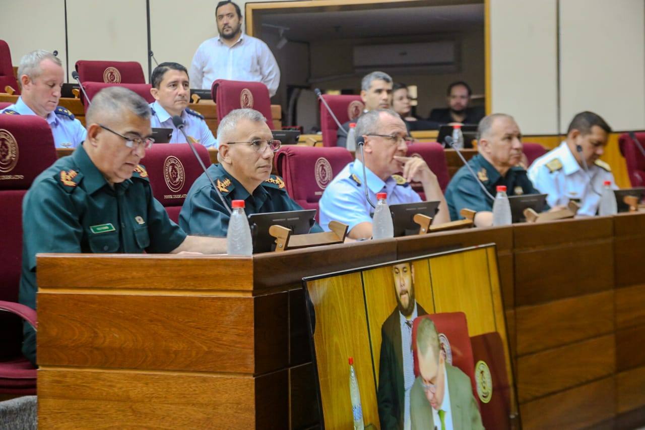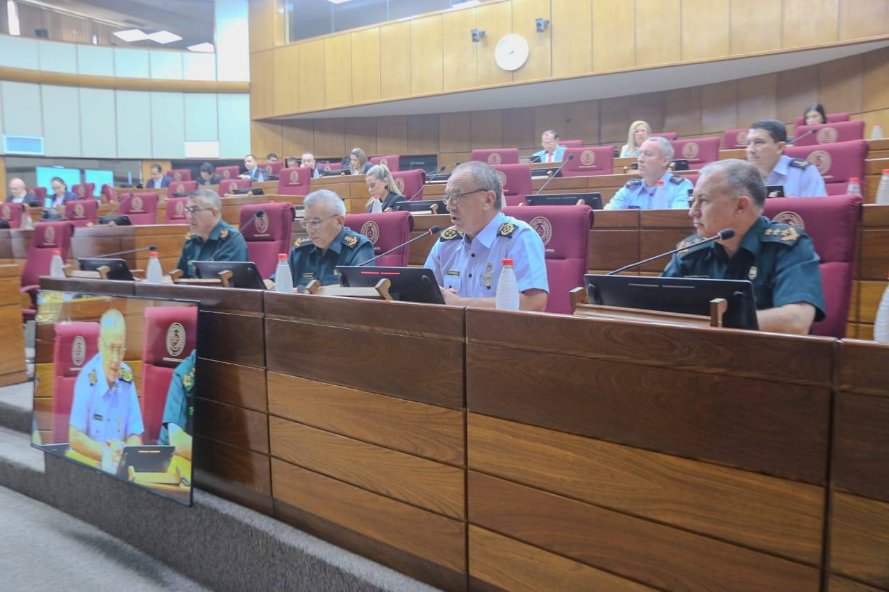 El Ministro de Defensa Nacional, Gral Ej (R) Óscar González, acompañado del Comandante de las Fuerzas Militares, Gral Ej César Moreno; de los Comandantes de las Fuerzas Singulares y del Oficial Asesor y Enlace ante el Congreso Nacional, Gral Div Roberto Olmedo; participó en sede del Congreso Nacional de la reunión extraordinaria conjunta de la Comisión de Relaciones Exteriores y Asuntos Internacionales convocada por el Director de la Comisión de Asuntos Constitucionales, Defensa Nacional y Fuerza Pública, Abg. Humberto Fernández, a fin de responder a las consultas en el marco del Proyecto de Ley “Memorando de Entendimiento entre el Ministerio de Defensa de la República del Paraguay y el Departamento de Defensa de los Estados Unidos, concerniente a la adquisición de artículos de defensa y servicios de defensa para la República del Paraguay de los Estados Unidos de América”.
